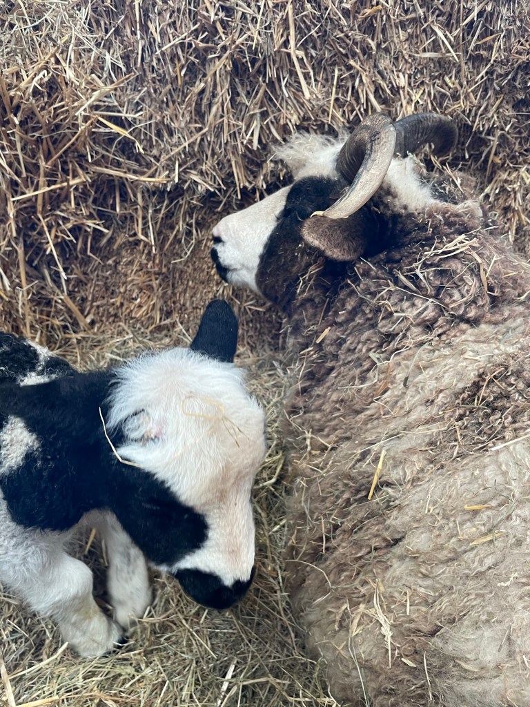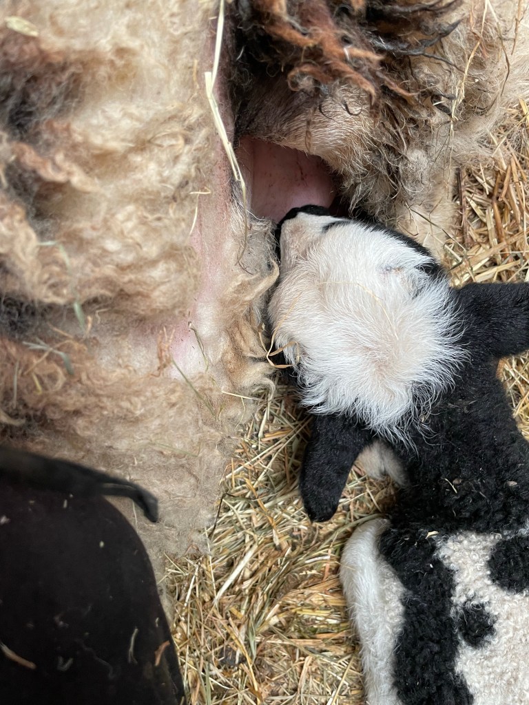 Pinky is trying to stand but mostly sitting. She still tries to buff Cassius but I put the lamb onto her teat and held Pinky’s back leg down so that she couldn’t kick the lamb. He sucked away
