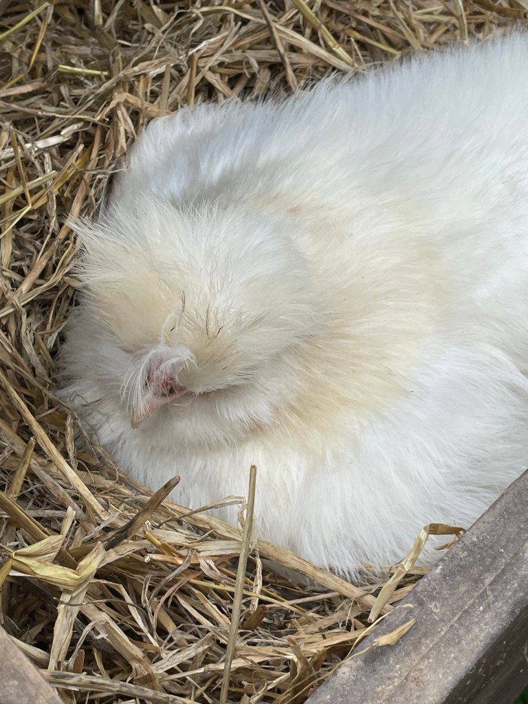 A Mrs Silkie has “gone broody” and we have taken her from the Silkie enclosure and put her in her own house on two goose eggs. Good luck madam – 30 plus days and counting