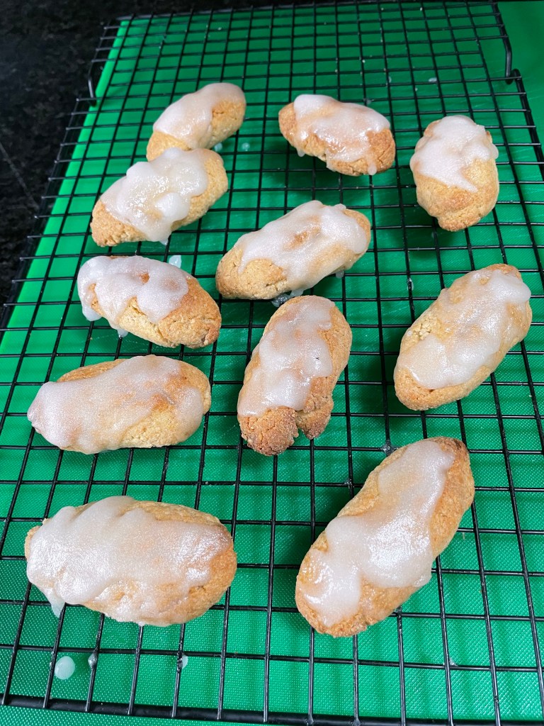 I mixed some sugar, Ground almonds and cake matzo meal, lemon juice and eggs yolks. Baked for 20 minutes and when they came out of the oven I topped them with a mixture of lemon juice and caster sugar