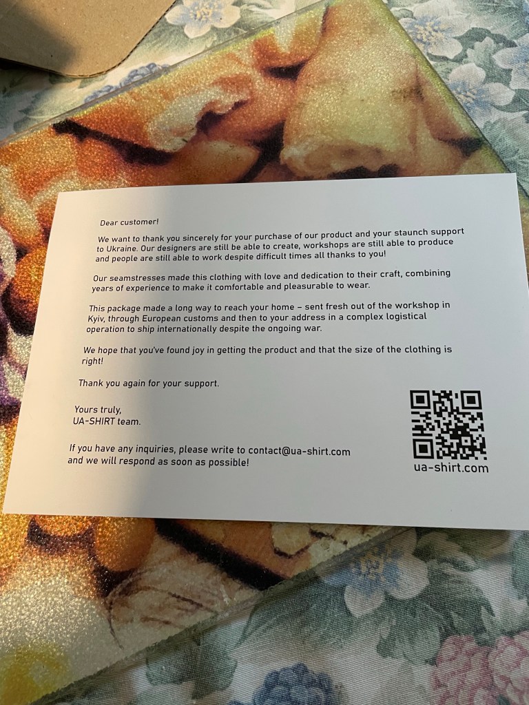 March 29, 2023 by gfreedman2013 Arrived home from the Wednesday walk to find a special delivery parcel. What an awesome present made in Kyiv, shipped to France and then to the UK Thank you N for such a thoughtful and poignant present If you want one write to contact@ua-shirt.com Share this: Share on X (Opens in new window) X Share on Facebook (Opens in new window) Facebook Like Loading... Related