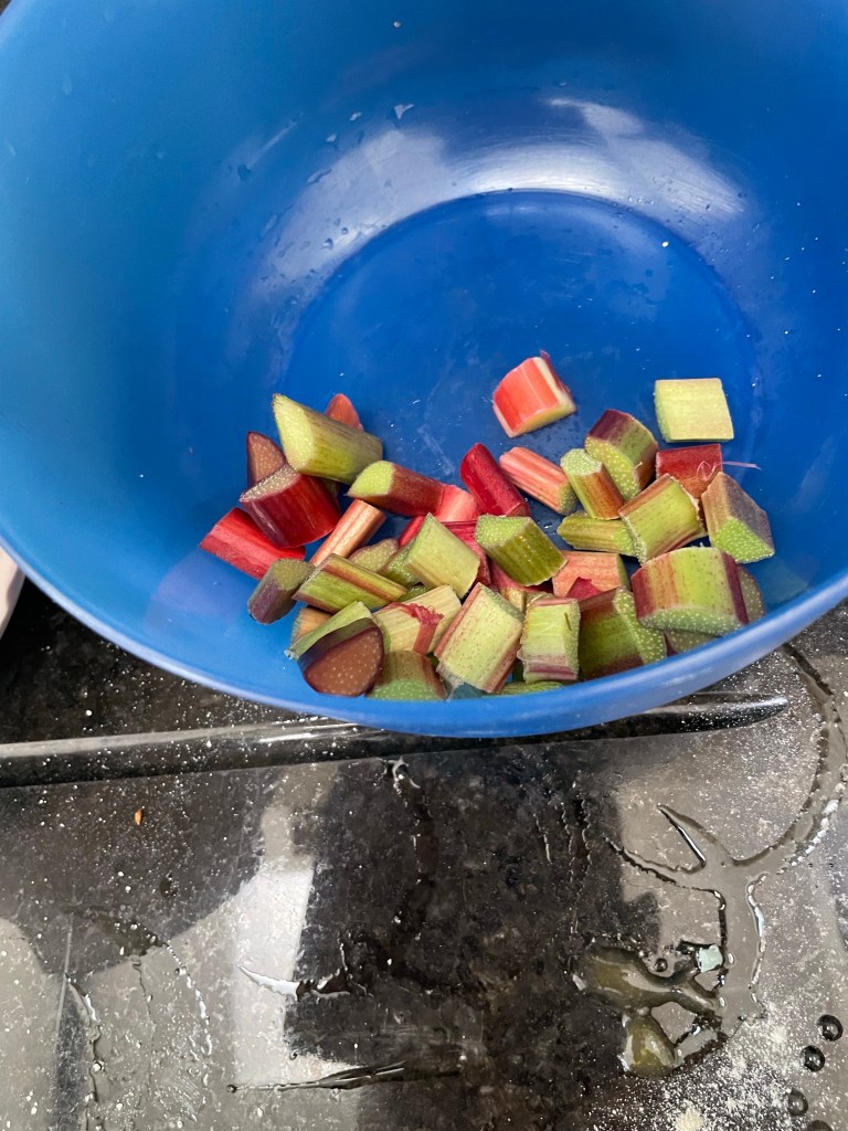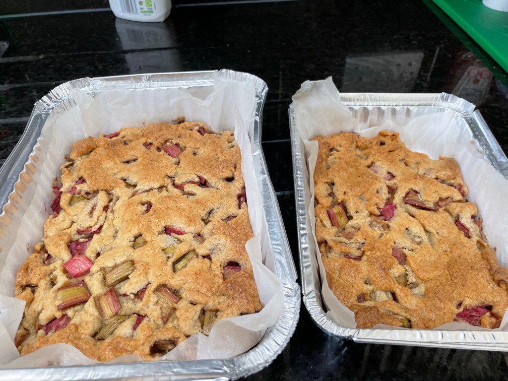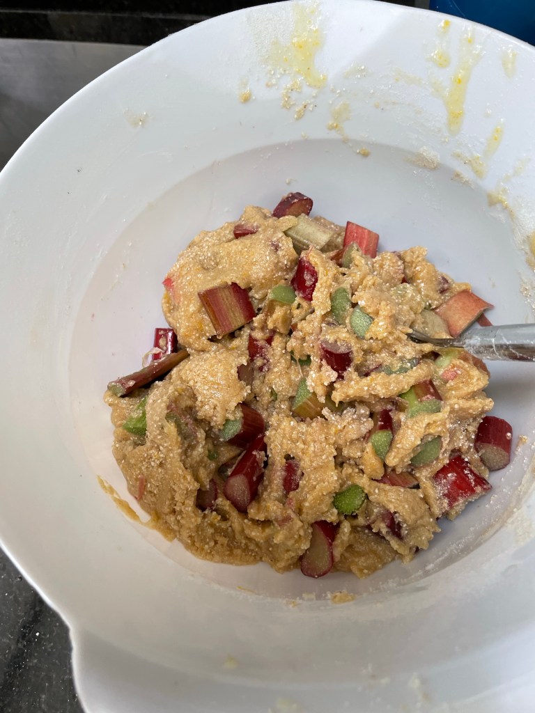 Garden rhubarbSunflower oil, caster sugar, Pesach cake matzo meal, fine matzo meal plus eggs Bake for an hour and (dare I say) pretty darned delicious Cauliflower cooked and mashed mixed with ground almonds, fine Matzo meal, sautéed garlic and onion and four eggs. Going into the oven in a minute