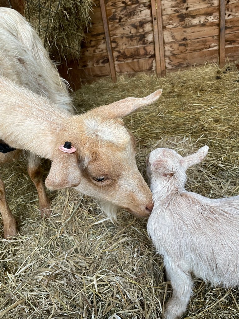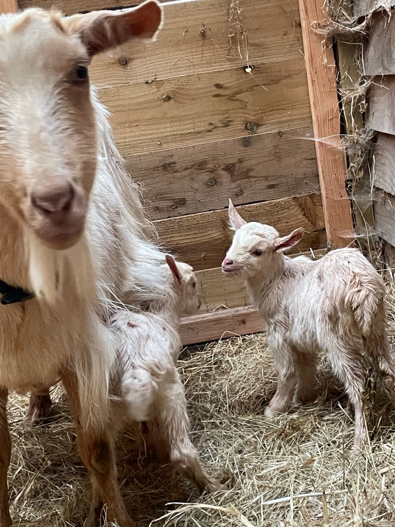 The twin kids seem to be eating. We have closed them in with mother Ruth overnight. Grandma Willow is not best pleased. She wants to be in on the action