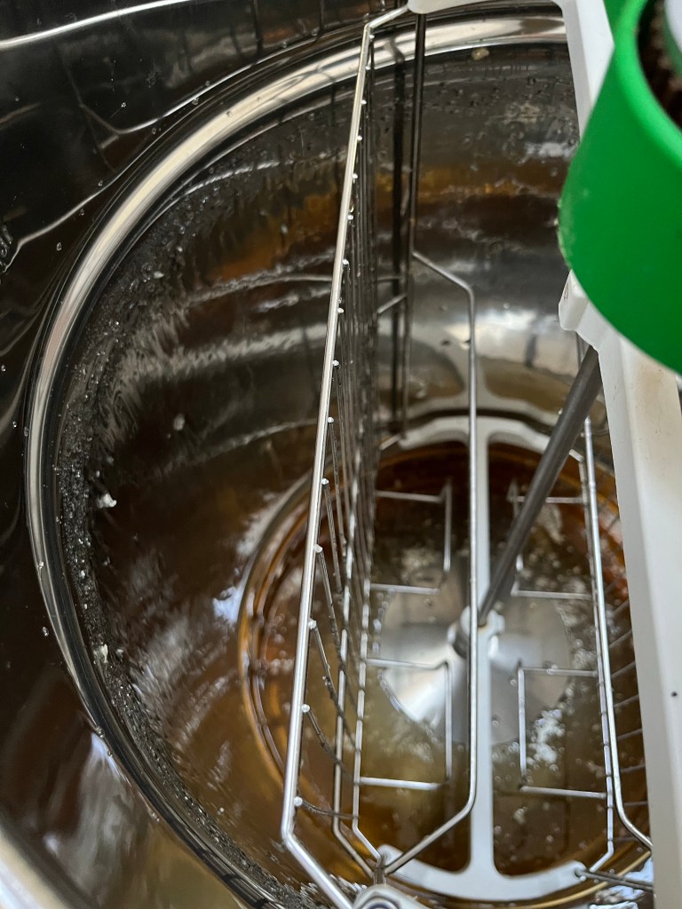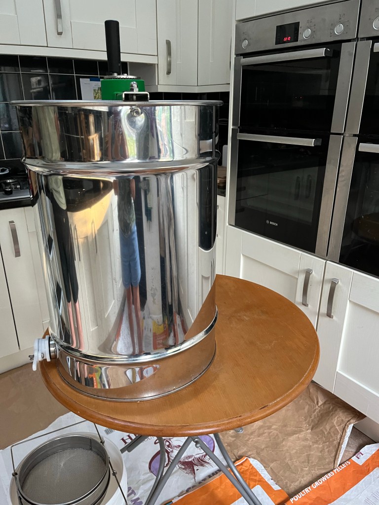The frames, capped and filled with honey The honey spinner- the frames go in, four at a time and we turn the handle using old fashioned elbow greaseThe inside of the spinner The honey is released into a double metal sieve below to remove wax and impurities The sieve which sits on top of the honey bucket Thirty two jars of pure, golden Gables honey. Click below