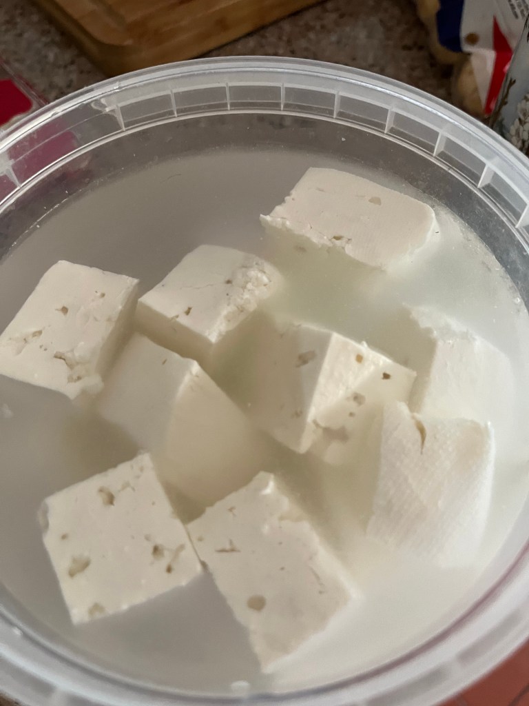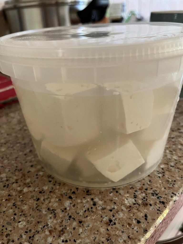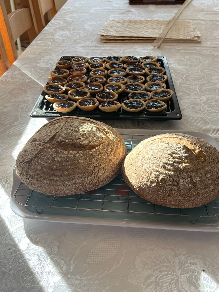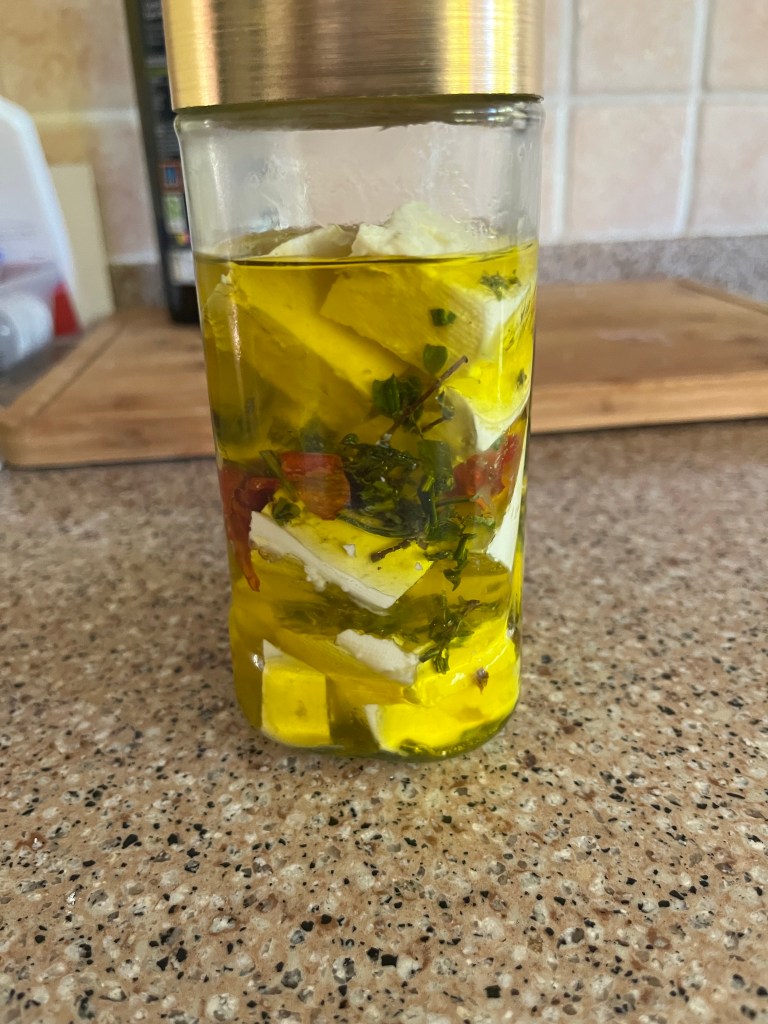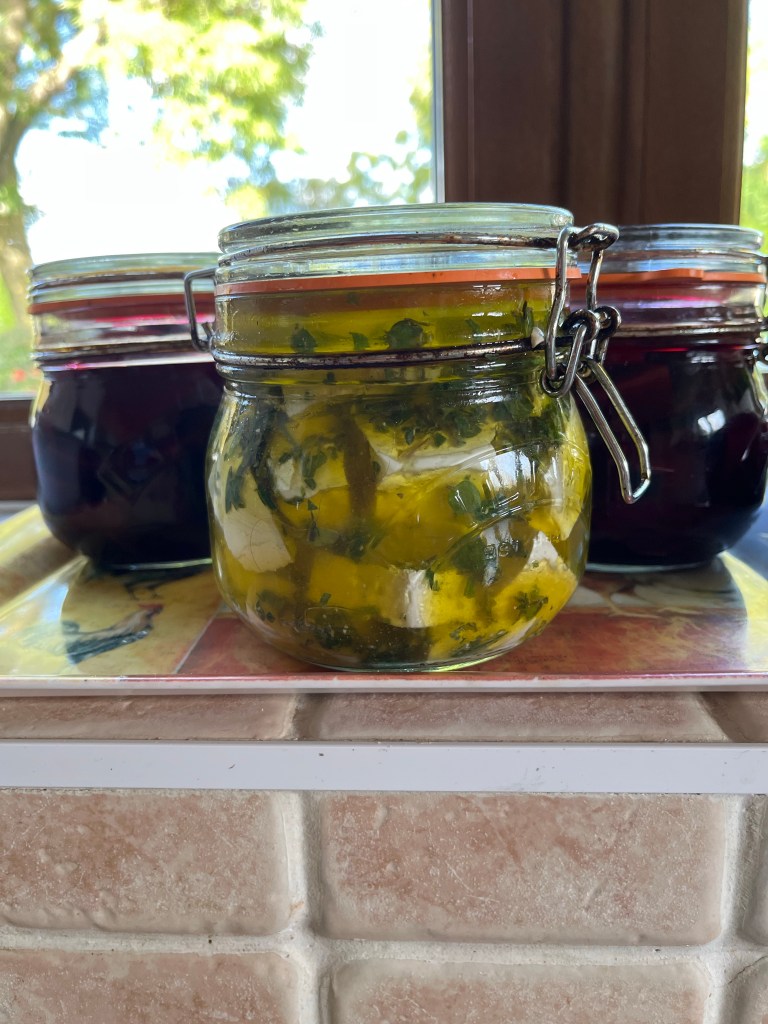 Sour dough bread and jam tarts baked early The feta cheese Jeremy made yesterday has been divided into three The first third is sitting in brine in the fridge The second lot is in olive oil and herbs The last part in olive oil, herbs and chilli pepper