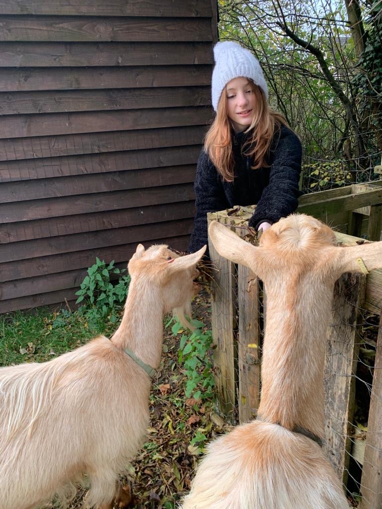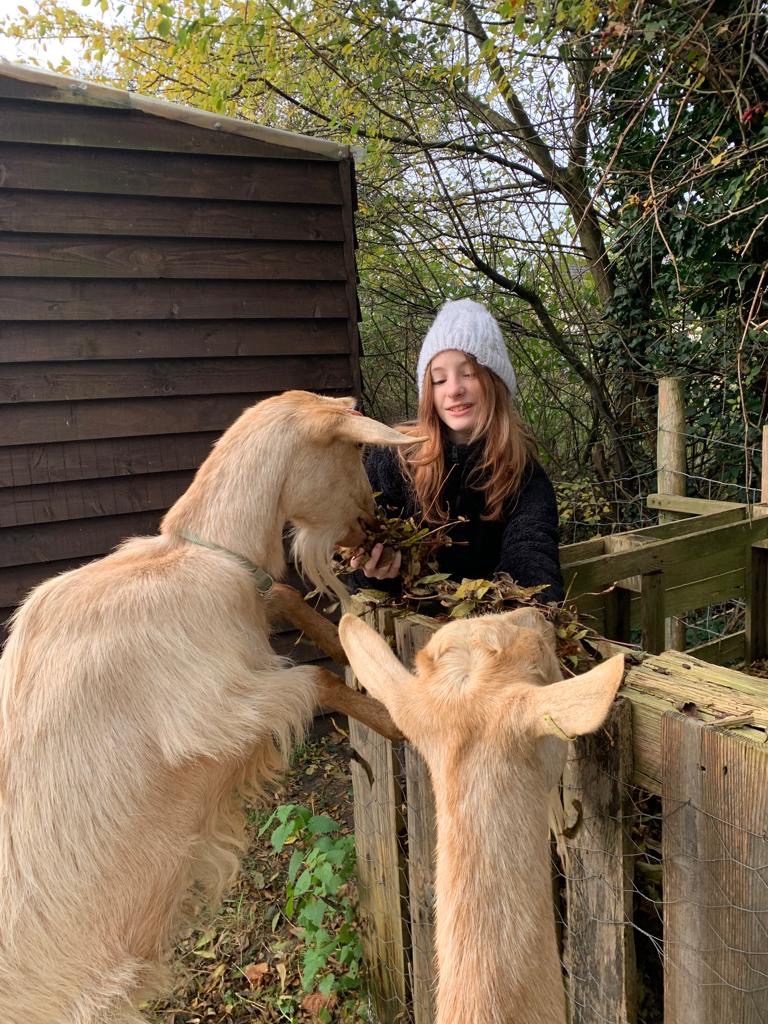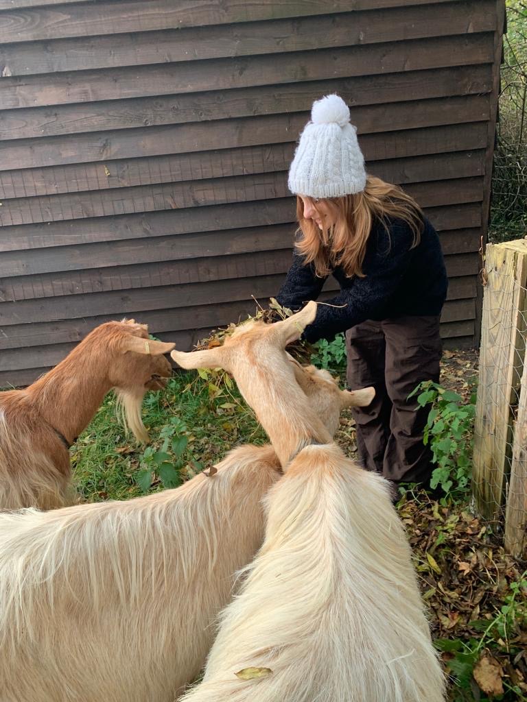 One of the visitors helped Jeremy with the animals this morning. She and I then went to see the goats and gave them handfuls of leaves – they love them.