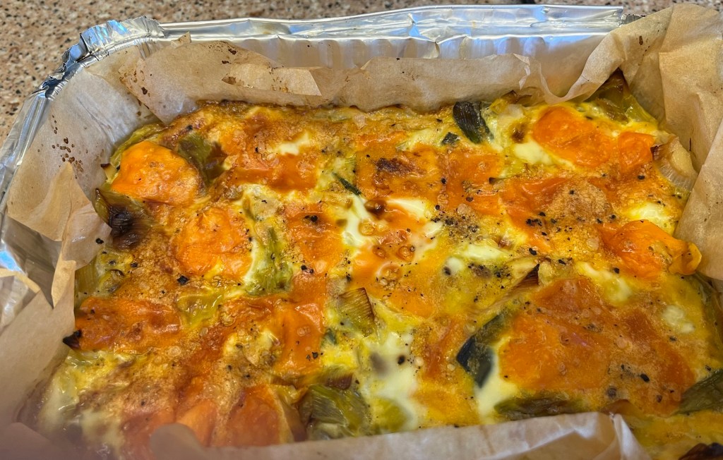 Luckily the hungry trio ran to us for their bottles. At Friday night dinner one of the dishes was a leek quiche (without pastry) made from our eggs, leeks and goat cheddar
