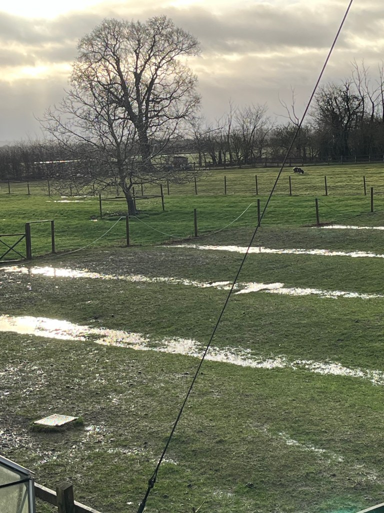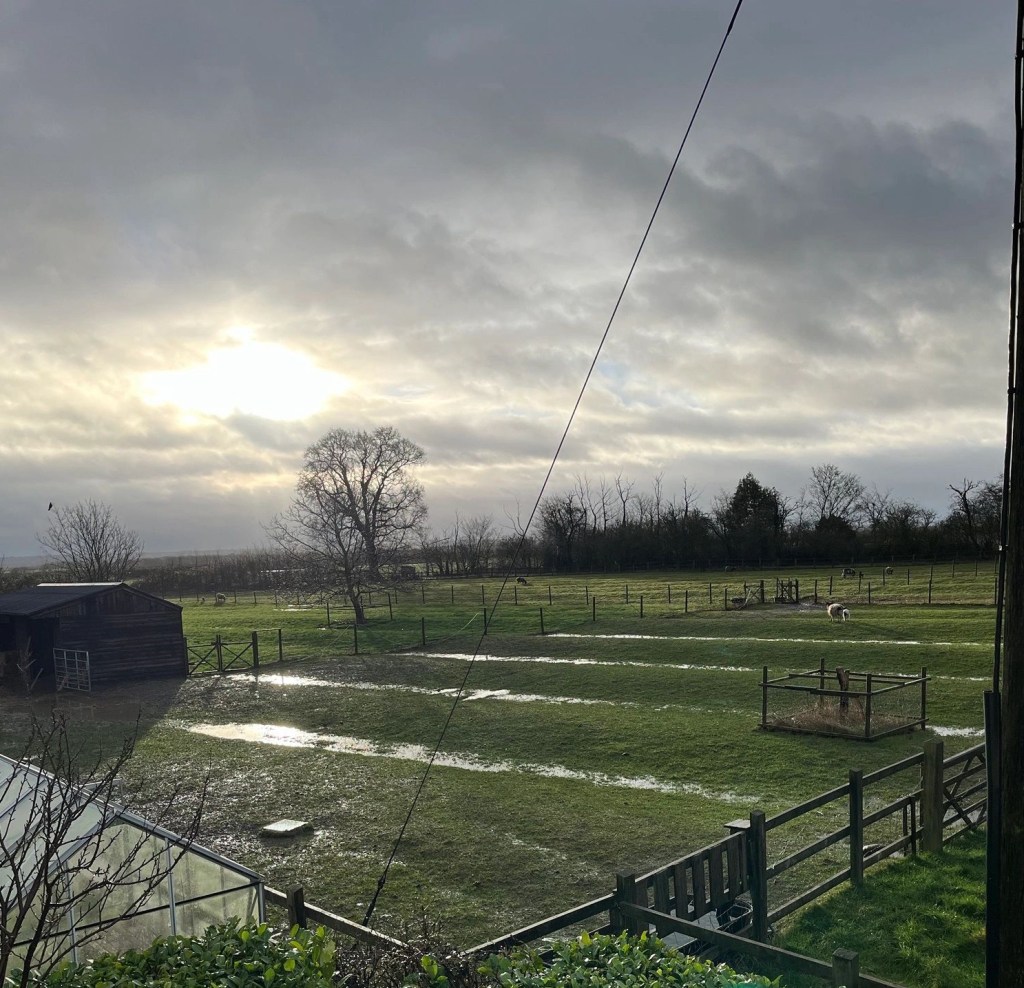 The furrows in our ridge and furrow field look like brooks. I feel sorry for the sheep who have perpetually wet hooves. Both barns are open yet many of the flock choose to remain outdoors.