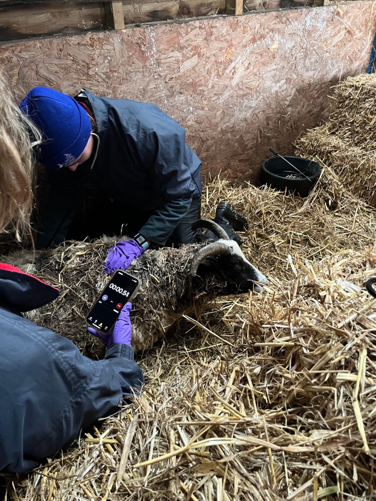 Last night at 10 o’clock we went out to give the three bottle fed lambs their last feed and to check on the one remaining pregnant sheep, Gertie. She was lying down with a dead lamb next to her snd was still in labour. I had to pull the second lifeless lamb out of her after which she was exhausted and stayed on the ground. We lifted her gently onto a wheelbarrow and wheeled her, by torchlight, to a pen in the barn where we made her comfortable. This morning she was still lying down looking the worse for wear. I called the vet school and another vet we know came out this afternoon with six final year students. They examined Gertie and found a third lamb inside her which they pulled out – lifeless with a twisted head. Poor old Gertie. We have been given injections to administer this week and hope that she will revive.