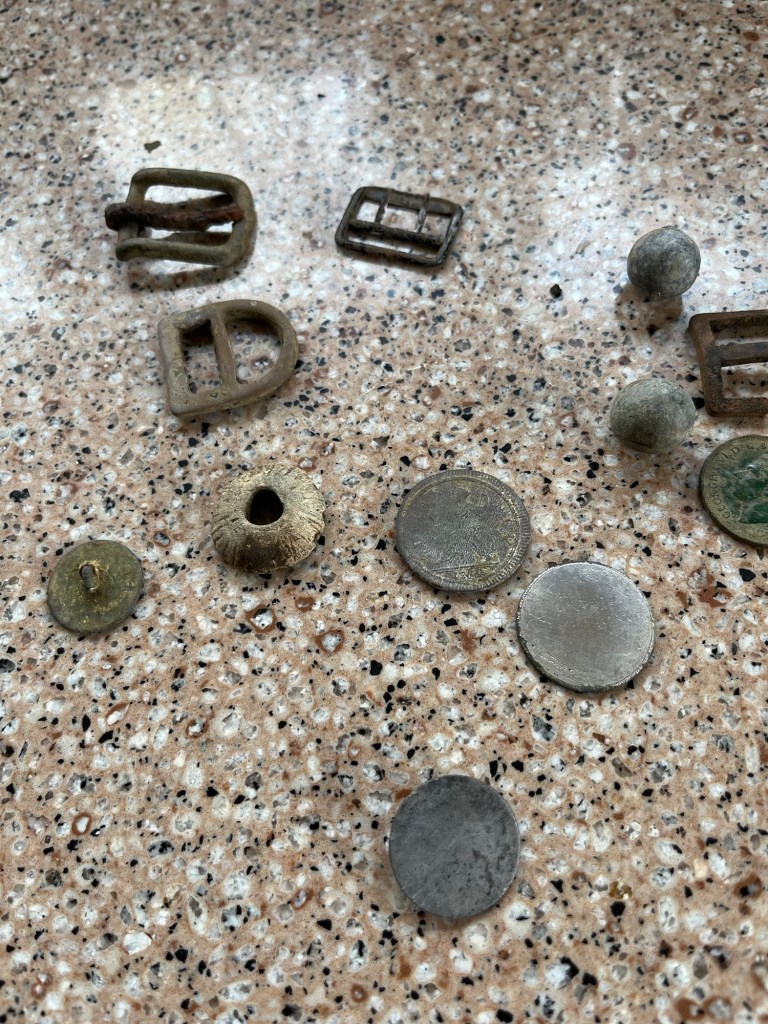 February 20, 2024 by gfreedman2013 Tiny treasures A spindle weight I might use it on a drop spindle to spin some wool A George I halfpenny 17-9? Some buttons and buckles And the Detectorists got a well earned coffee and homemade marble cake Share this: Share on X (Opens in new window) X Share on Facebook (Opens in new window) Facebook Like Loading... Related