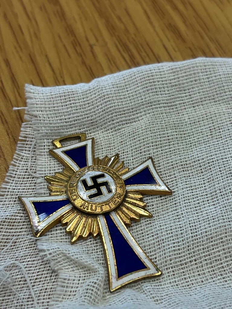 Inside the class we had all written pieces under the title The Gift. It was, as always, a mixed bag. Some made me laugh, some bored me to doodling and several people need to be trained in reading aloud. When our group captain started to read she held a small black pouch in her hand and looked nervously at me saying, “ I don’t usually write true stories and I hope this won’t be triggering when you see what’s in the bag.” Hmmmm. She read the piece about her late Irish mother-in-law who had worked in post war Germany and taken food from the British soldiers’ mess to give to a malnourished German child who appeared outside the kitchen every day. She felt sorry for her especially when she heard that six more children were at home with a sick baby. One day the child’s mother arrived with a gift to thank the kitchen worker for the food which had helped the baby to survive. Three older sons had not returned from the fighting. The woman handed over the following object. Yes it is indeed triggering, chilling and hideous.