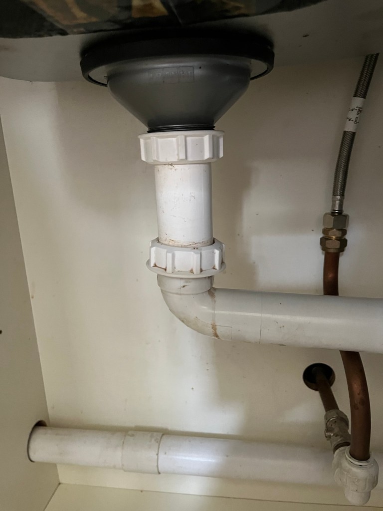 Back in the kitchen I found a puddle of water under the sink where the waste pipe had disconnected (it has happened several times over the past ten years). I had to put it back together again