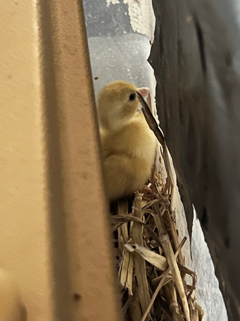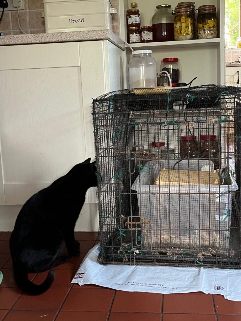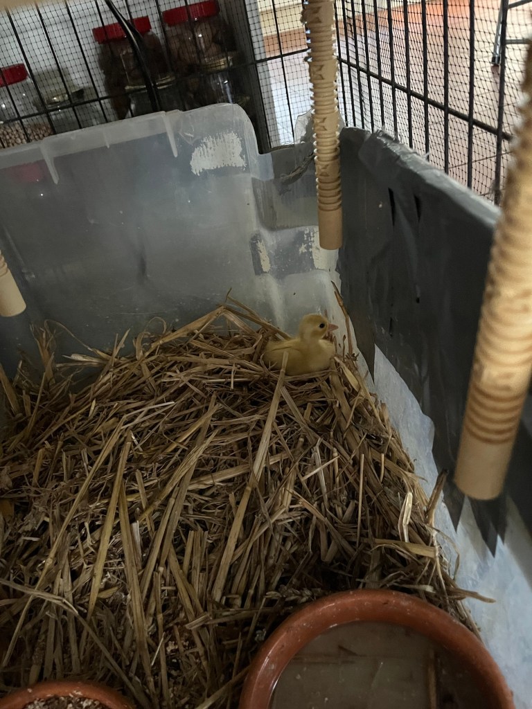 We brought the three day old duckling down to the kitchen. We have put netting around the cage and the duck box, food snd brooder plate are inside the cage. The cats are intrigued and dangerously interested