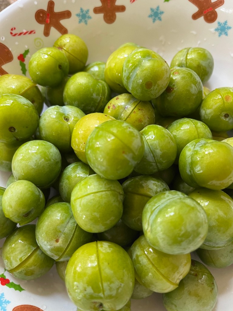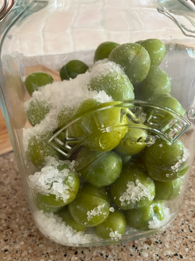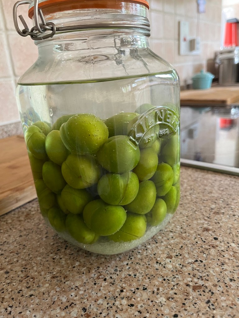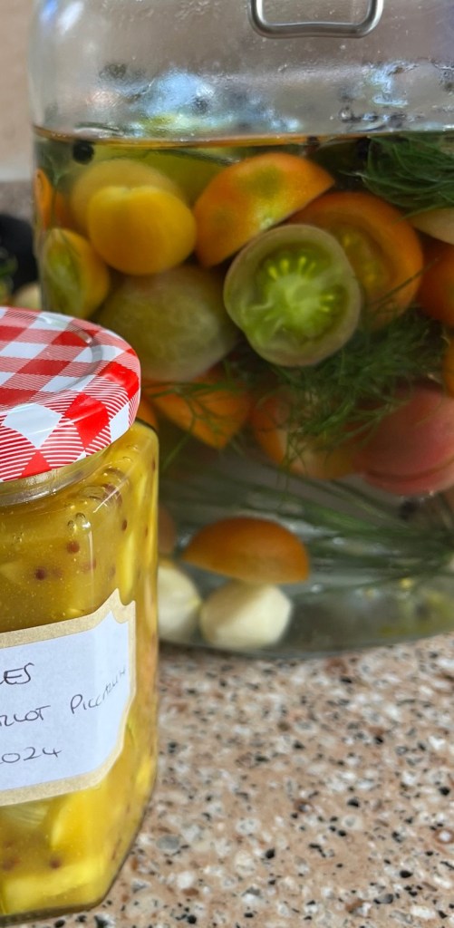And as the cherry tomatoes ripen outside and in the greenhouse….A sweet and sour jar of picked tomatoes Greengages picked this morning, washed and scored Packed into a kilner jar and rough salt added Topped with boiled water and then (as with the tomatoes) into the fridge for a week. I wonder if I’ll like the taste?Outside Large White butterflies (aka cabbage whites) flit from flower to flower