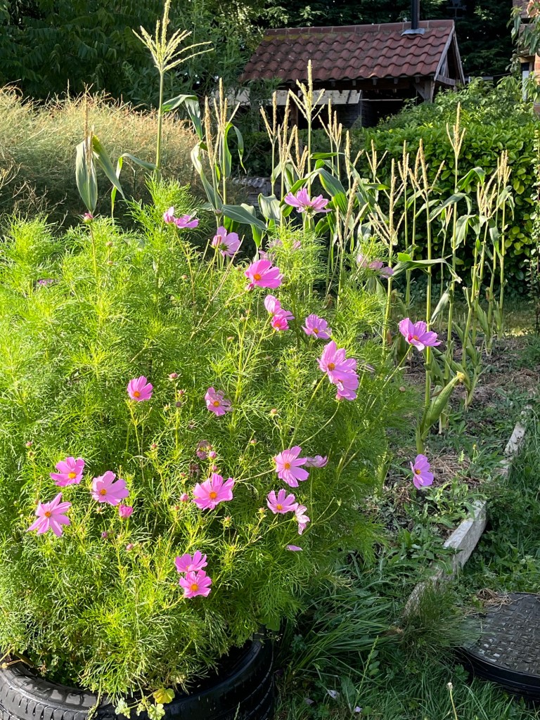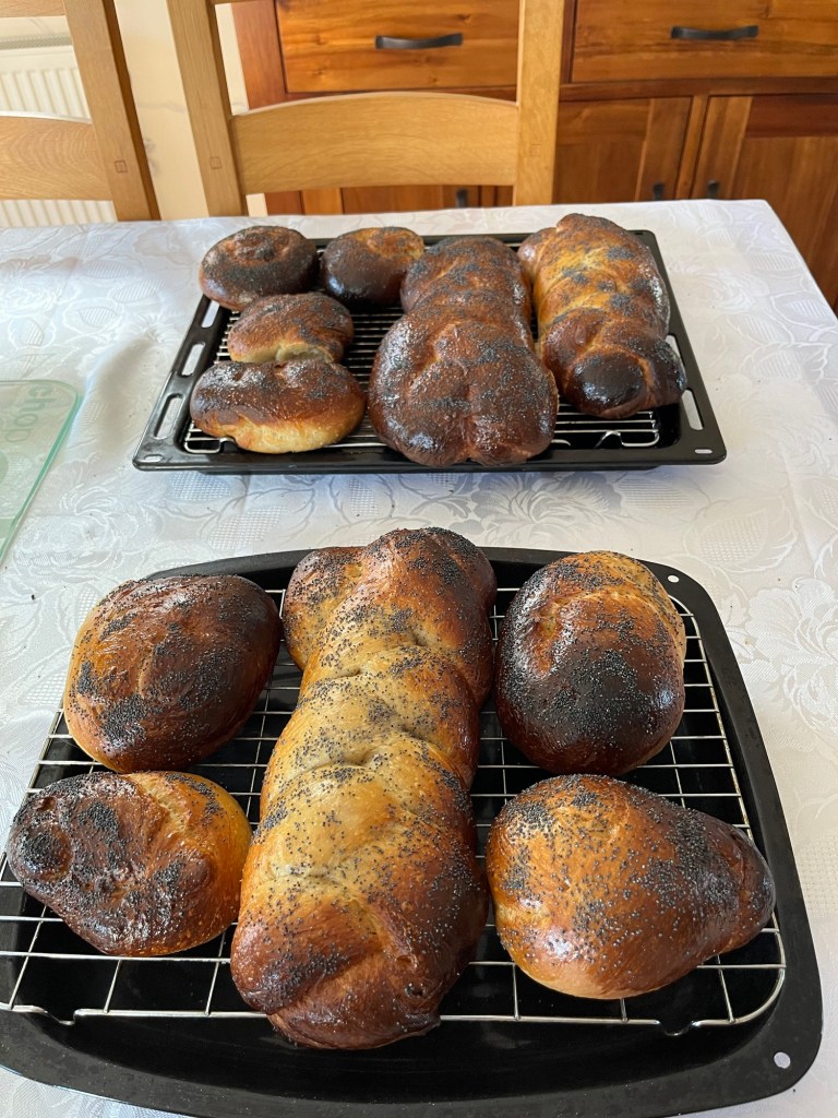 Domino has a scarred udder – when she lambs we will have to bottle feed any little onesThe cosmos flowers reward the daily watering In the dining room freshly baked chollahs are cooling. I’m