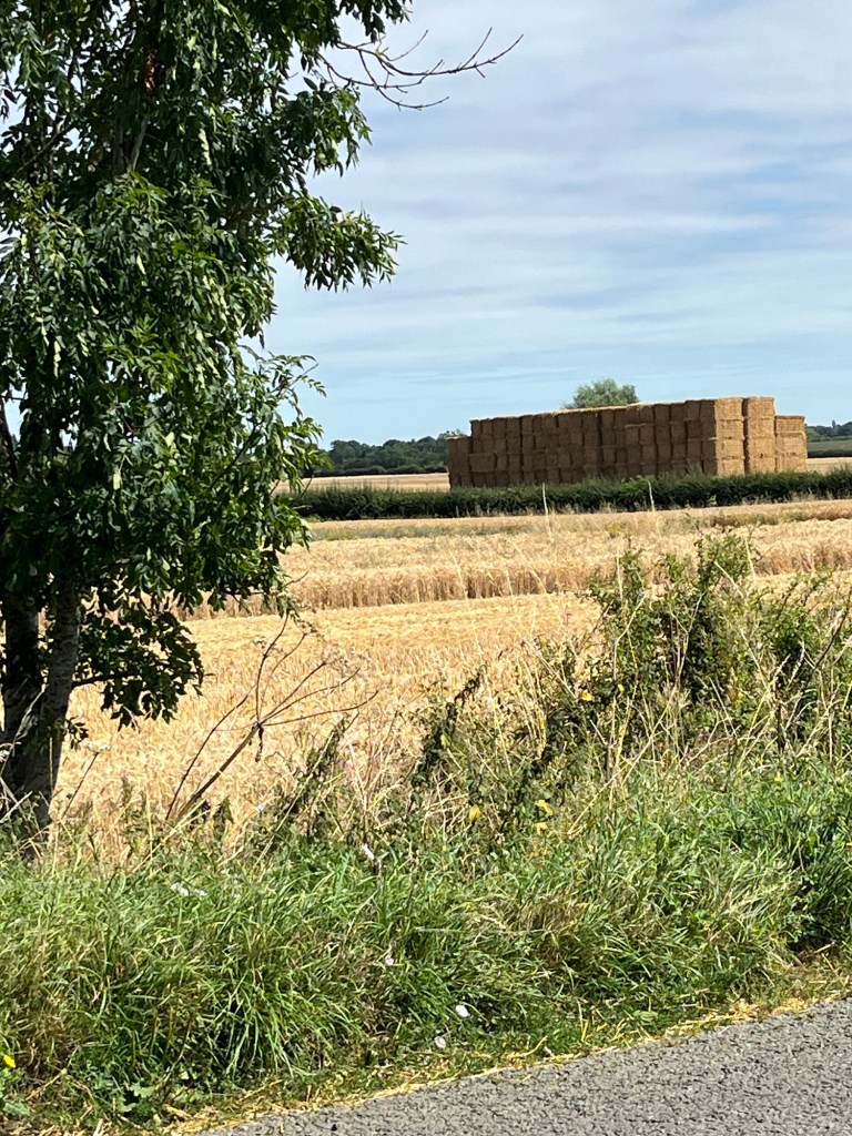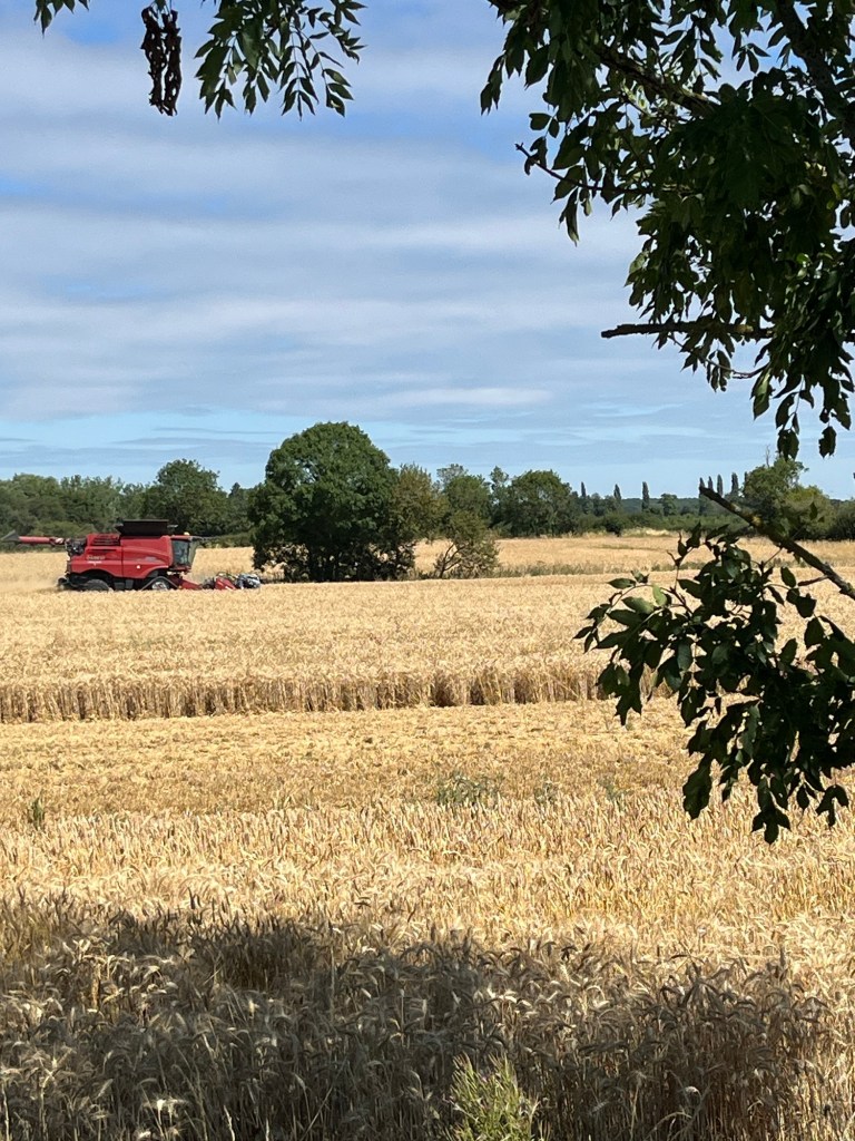Across the road from our gate the combine is going up and down the field harvesting the golden wheat