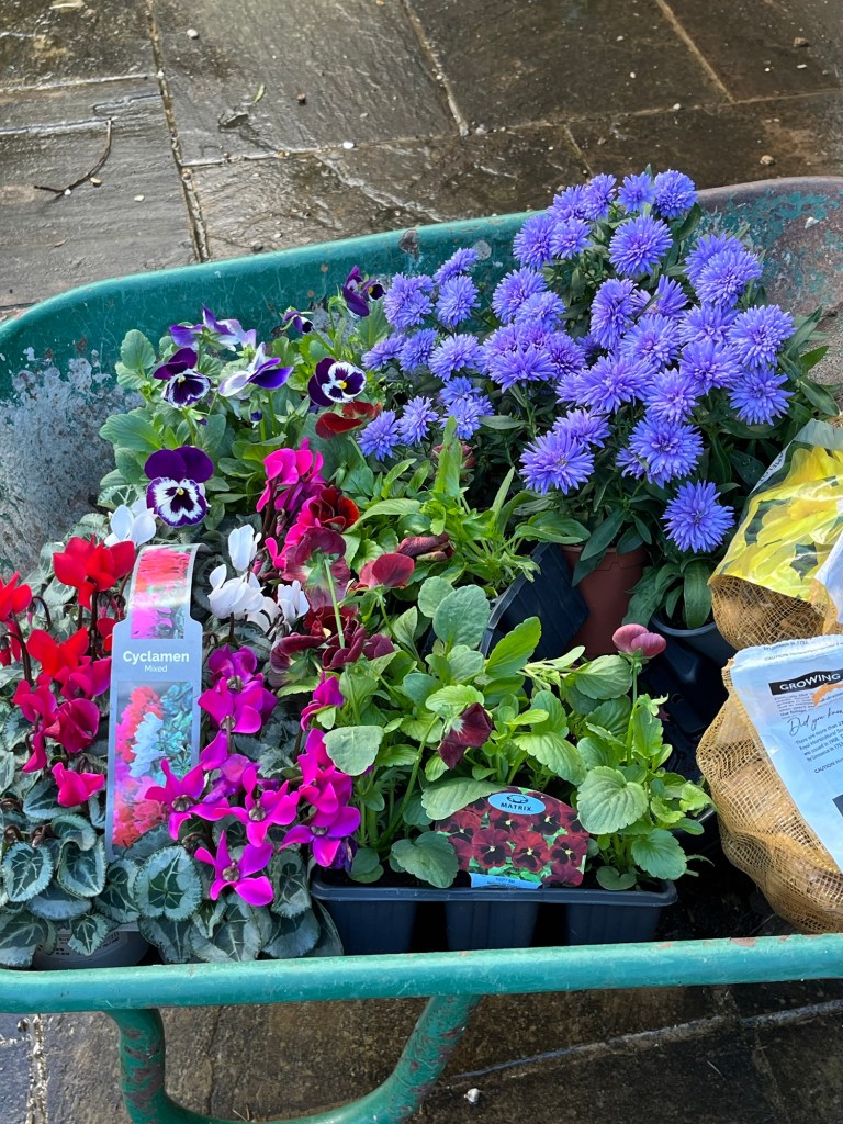 A barrow load of plants and bulbs brought home by Jeremy just now