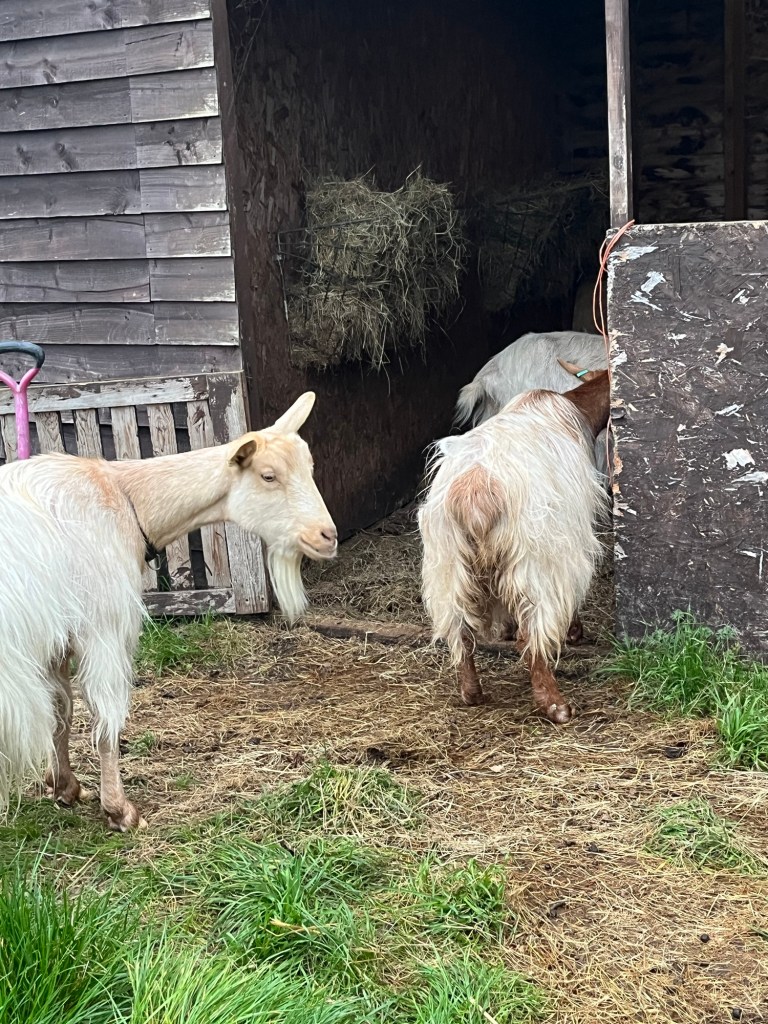 The goats aren’t pleased that their shed was mucked out yesterday.