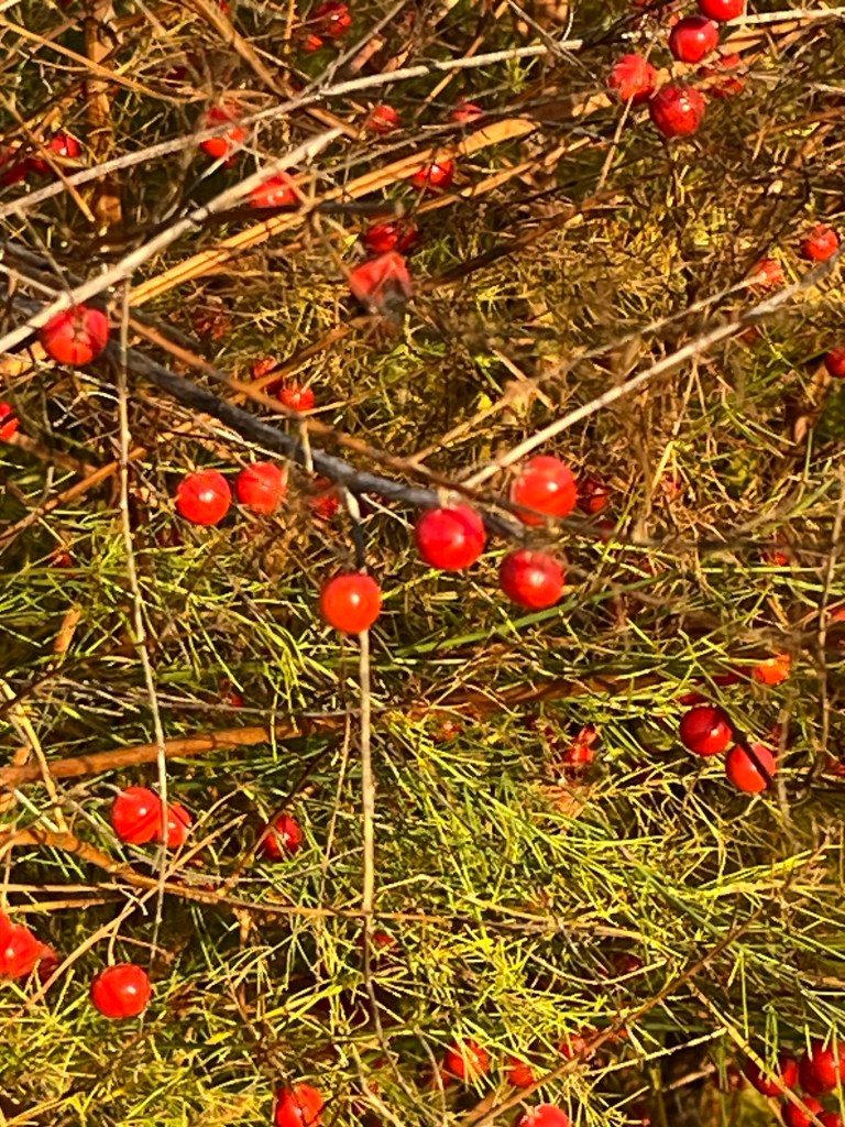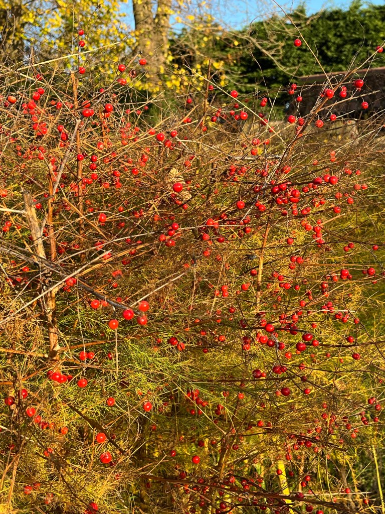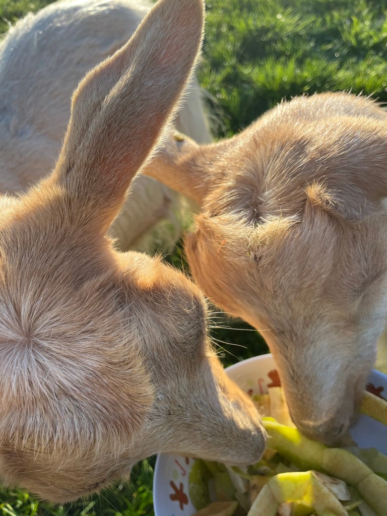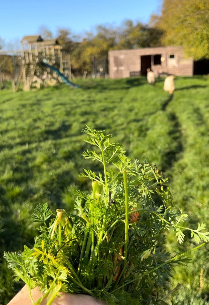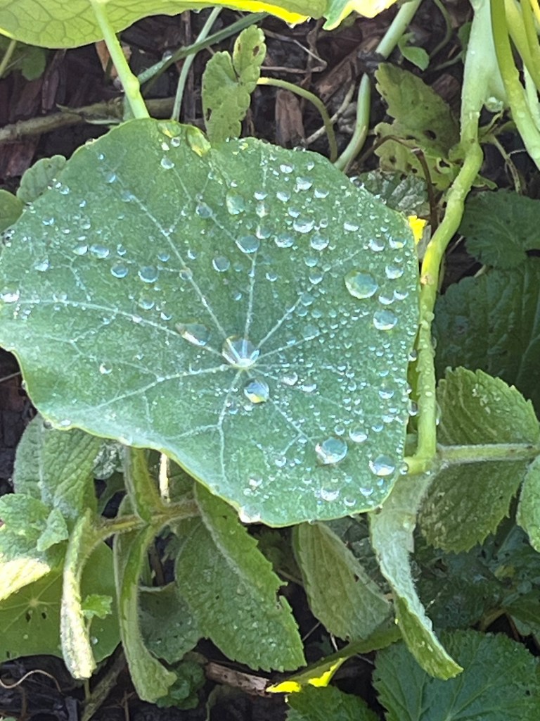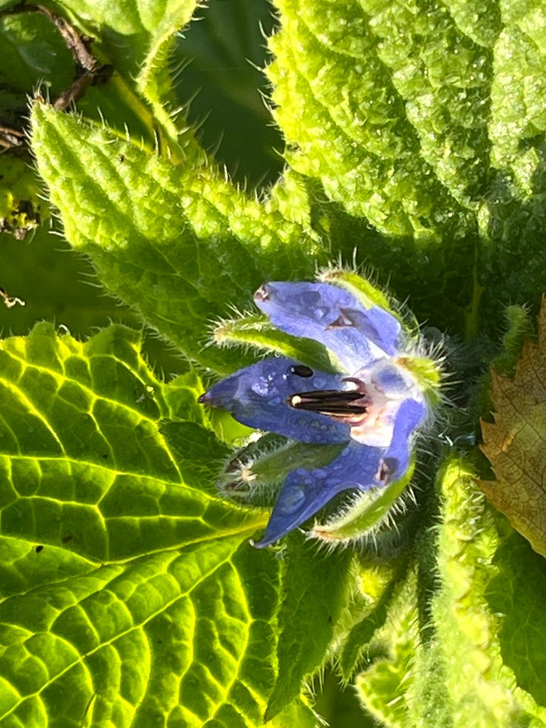 Dew on nasturtium leaves Flowering heather Flowering borage Asparagus seeds aplentyCome and get themApple peelings (I made apple cakes this morning) But below the goats aren’t keen on carrot tops They turned their noses up and left them on the ground!