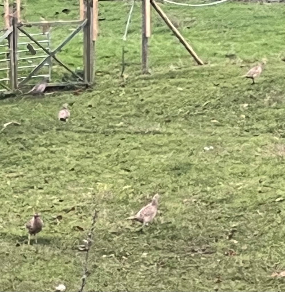 A colourful Pheasant is followed by his harem of dun-coloured pheasant hens. I’ve seen more pheasants out in our field and garden this year than ever before. Is that the same for others around here?