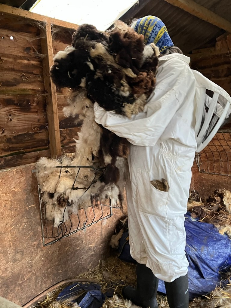 Although I mentioned many uses for wool in my book “Jews Milk Goats” (Amazon and other outlets) I didn’t talk about the way we use it here at The Gables to insulate beehives!