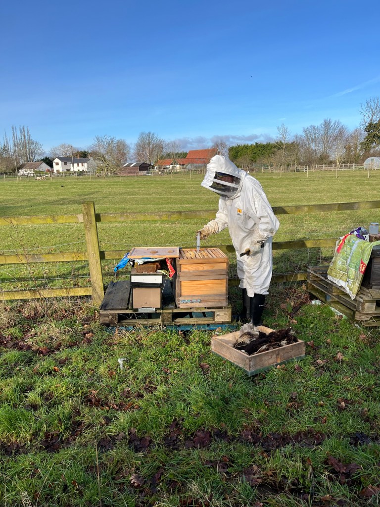 It has to be warm enough to uncover the hives and today was that day. We donned our bee suits, Jeremy mixed some oxalic acid with water, loaded syringes and then we went across the field and uncovered the hives. J sprayed the liquid in between the frames to kill off any varroa mites. I was amazed at how active the bees were even in the middle of winter. Keep going little ones. It might soon be spring.