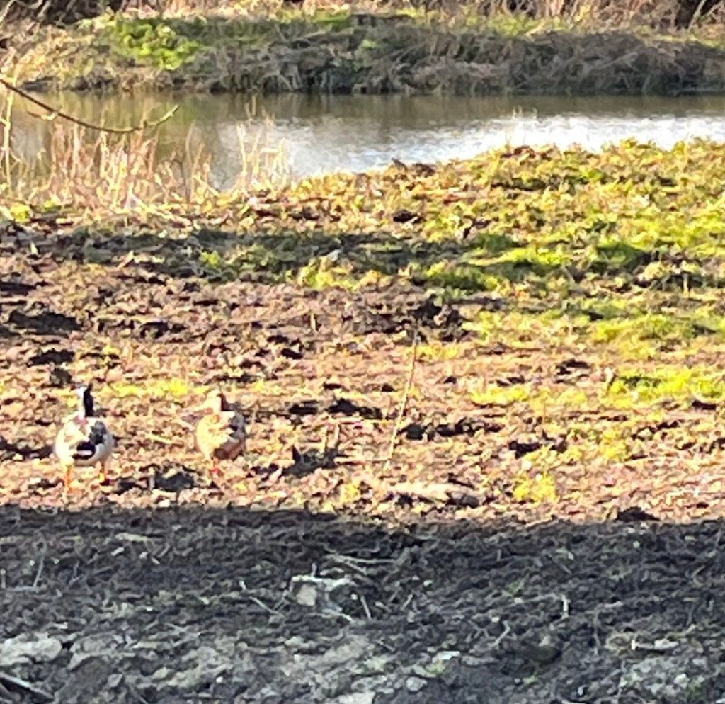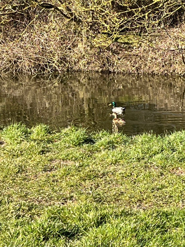 On our afternoon walk we came across two pairs of mallards on two separate ponds . They look just like the duck and drake that are swimming on our goose pond