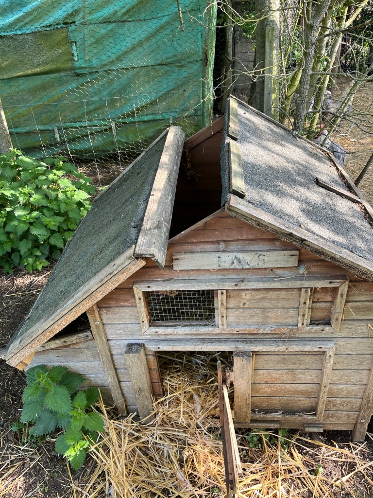 The door ripped off, the roof broken and the sitting hen and her eggs gone (no doubt killed and eaten).