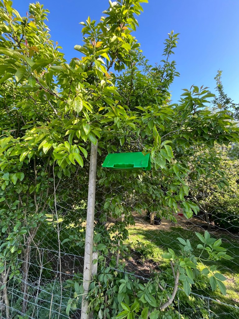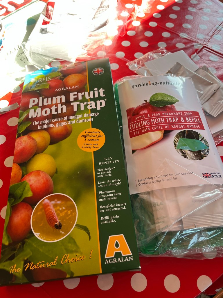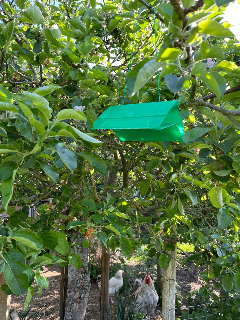 And will put another on a second Bramley tree further down the orchard. They contain pheromones that attract the male moth which dies on the sticky insert hidden in the container. Let’s hope it works