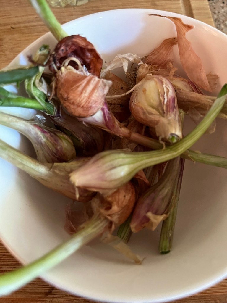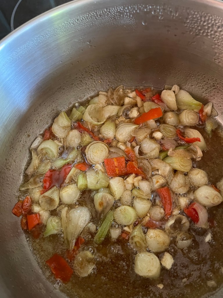 The first shallots from the garden Sautéed with home grown chillis Spicy lentil dhal Mabel doesn’t like any of those ingredients Nor the carrot salad I made later