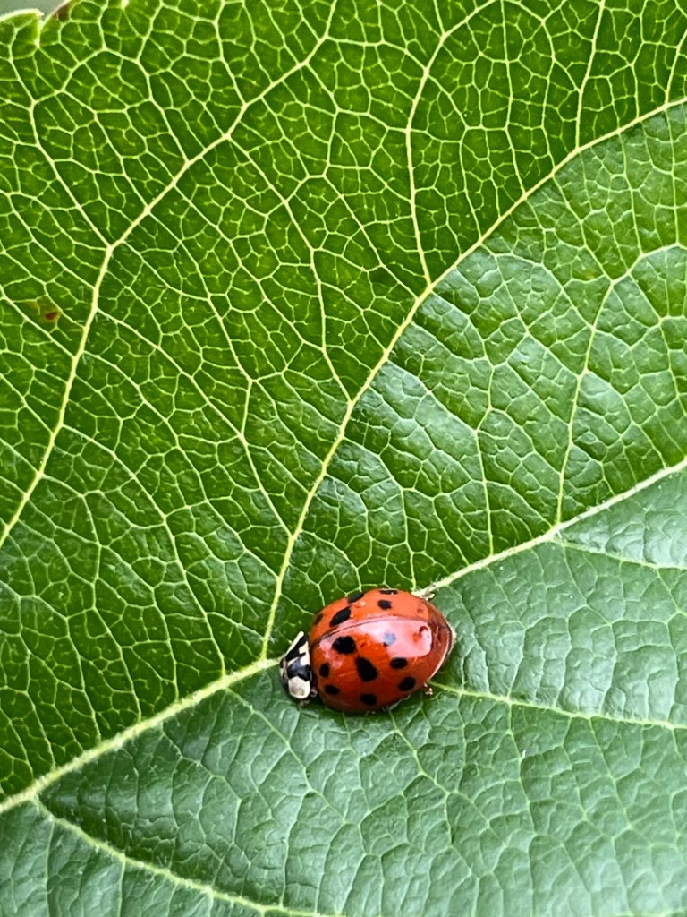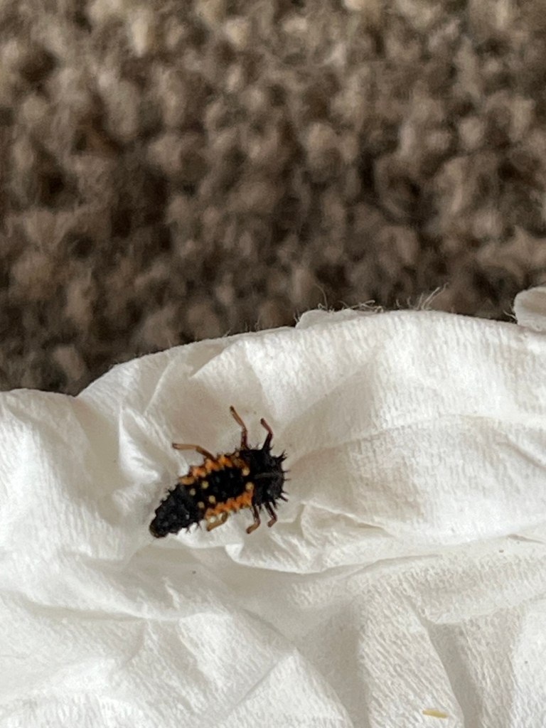 It’s the larvae of a Harlequin Ladybird. An invasive species that is destroying our native ladybirds BUT… it is also useful in controlling aphids. Heads you win, tails you lose!