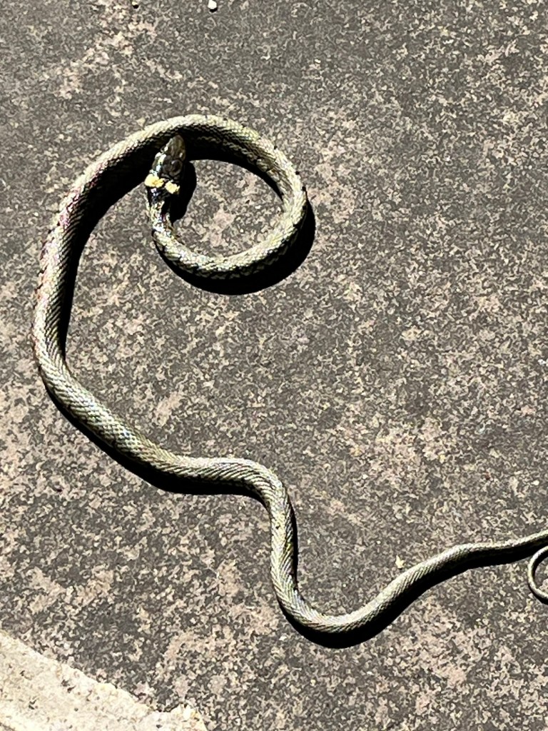 June 30, 2025 by gfreedman2013 Another day, another surprise in the courtyard A barred grass snake Sadly I think it succumbed to the heat Share this: Click to share on X (Opens in new window) X Click to share on Facebook (Opens in new window) Facebook Like Loading... Related
