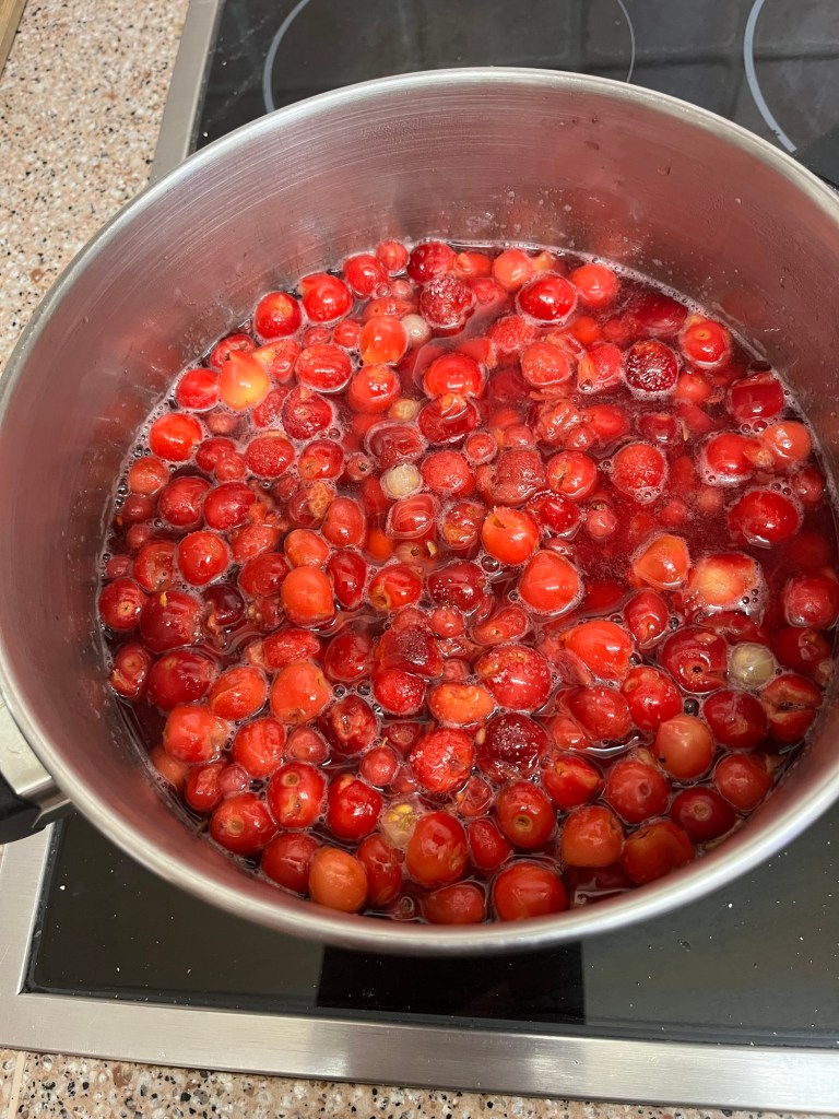 But they need stoning and lightly stewing with redcurrants and sugar. They are sour cherries after all (which is why the birds leave them alone)