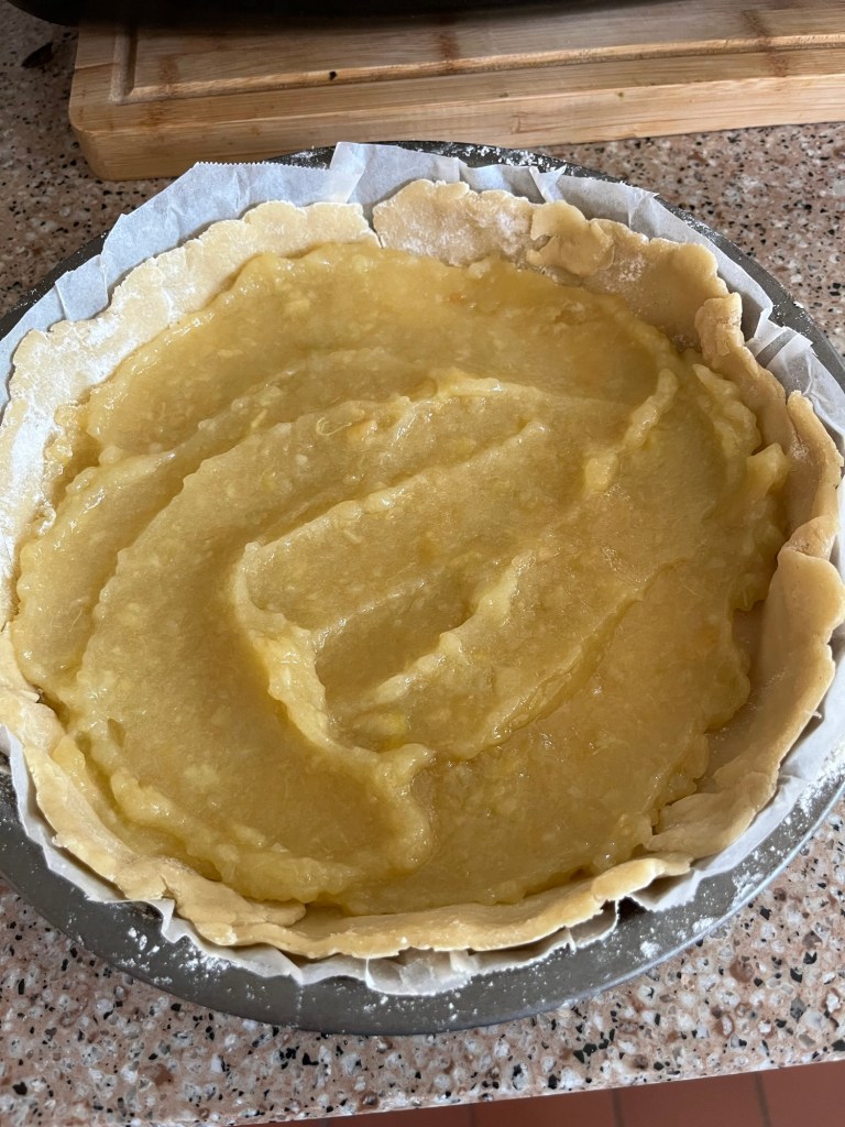 Pastry case filled with stewed apple made from orchard windfalls