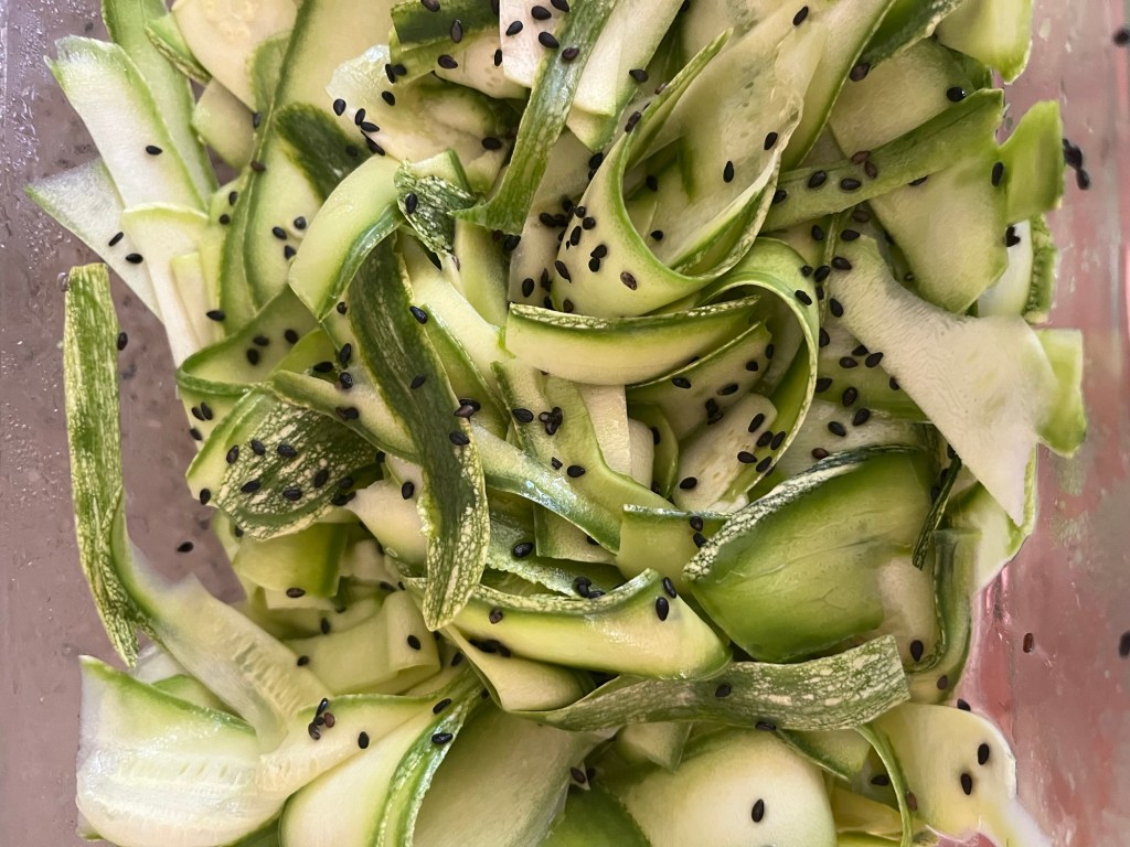 Home grown courgettes cut into ribbons and dressed with lemon juice and olive oil and black sesame seeds