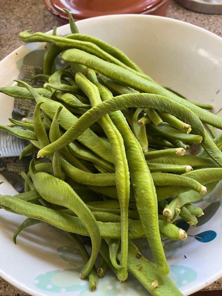 Many more dishes on the menu tonight. Courgette and tromboncino soup – cold with cream and chives. Leek bake, lentil Dahl, new potato salad and a green salad and young runner beans – hot with butter.