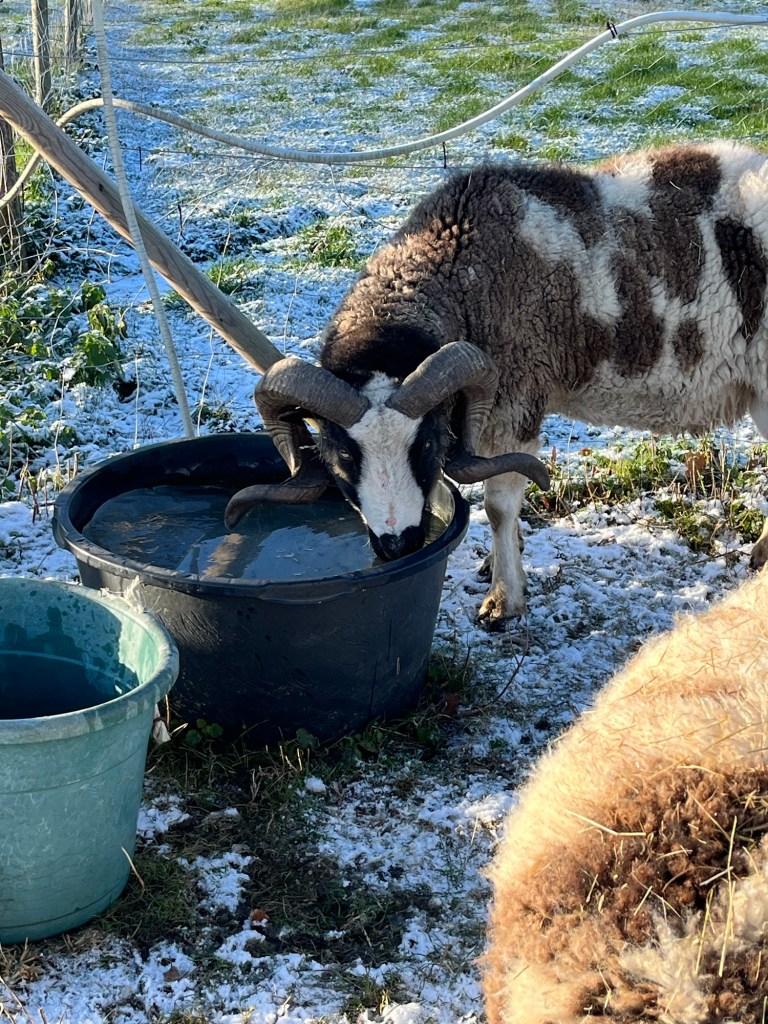 I went around with buckets of warm water to defrost the ice so that the sheep and birds could drink. Click below