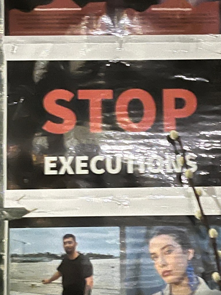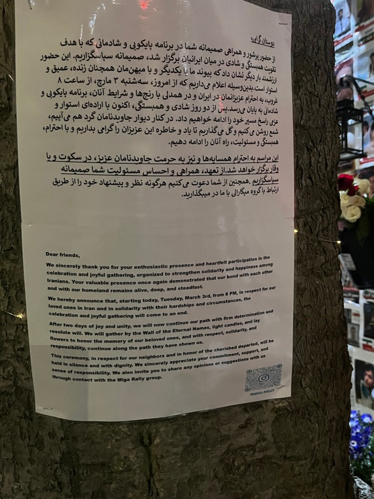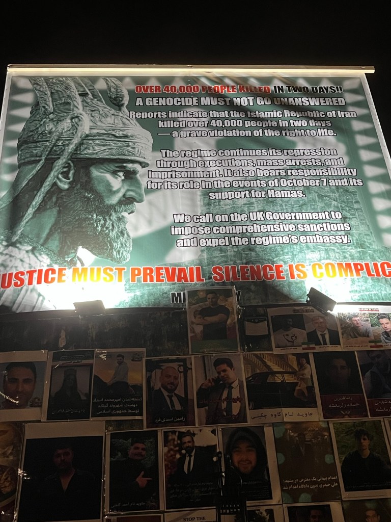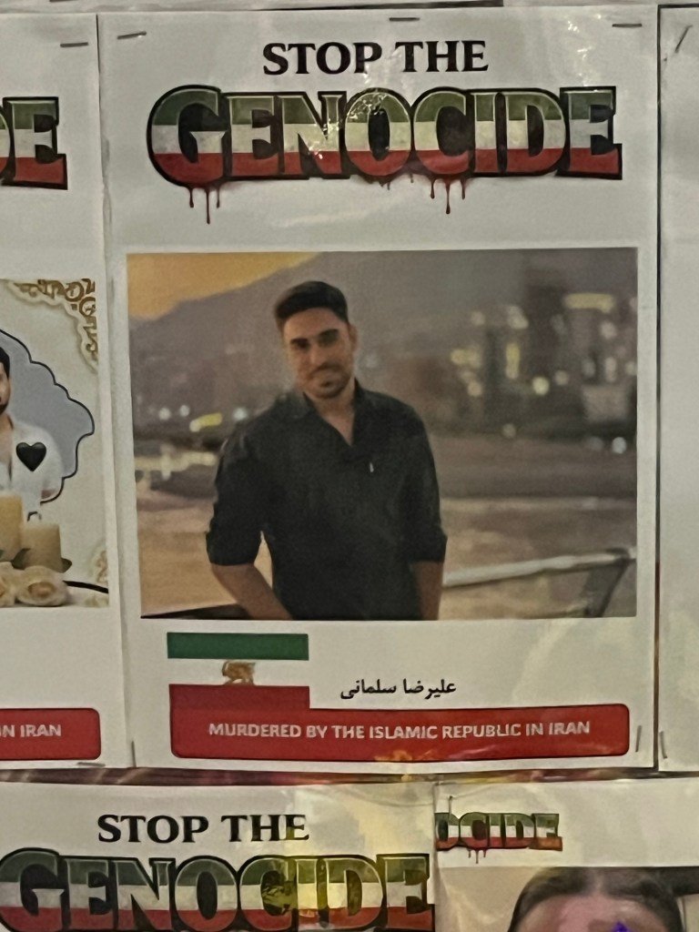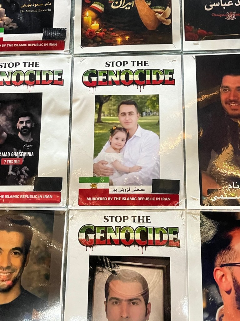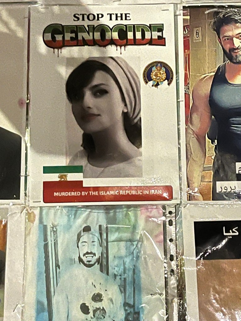 On the way home I parked the car in Golders Green Road to pay tribute to a heartbreaking memorial. This was on the site where the victims of the Nova Festival (gunned down on October 7th 2023) were commemorated. Now the large Iranian North London population in exile have covered the site with hundreds of photographs of the beautiful men, women, teenagers and even children who were gunned down by their own government in Iran – all for daring to call for regime change and democracy using their voices and not weapons. It is simply heartbreaking to stand in fronts of their photographs.