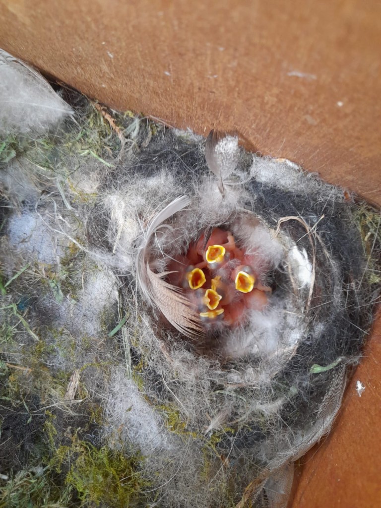 He took it with his phone after waiting for mum to leave the nest box to go and fetch food. He made the nest box with a hinged lid so he climbed on a ladder, lifted the top and snapped this fabulous photo.