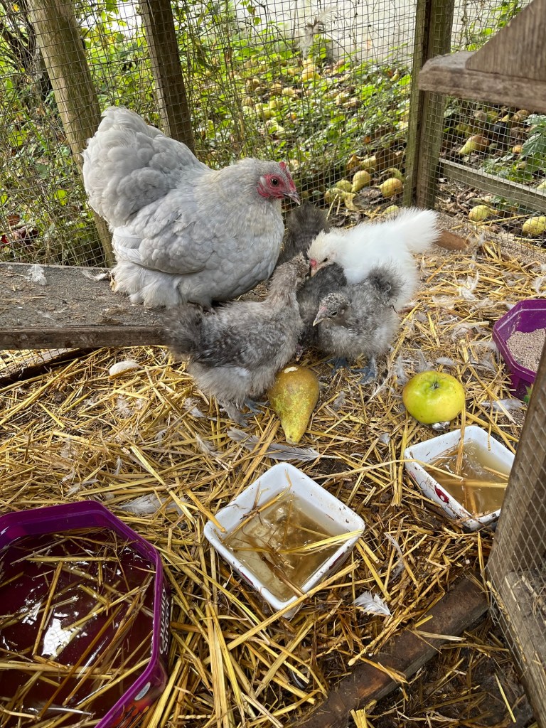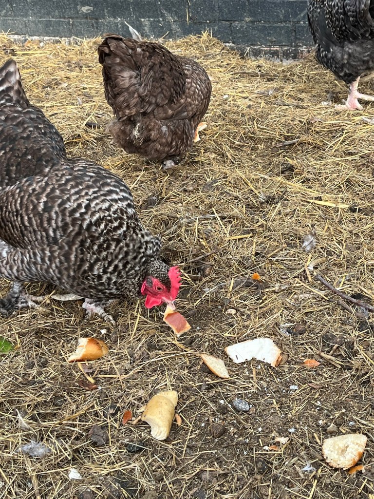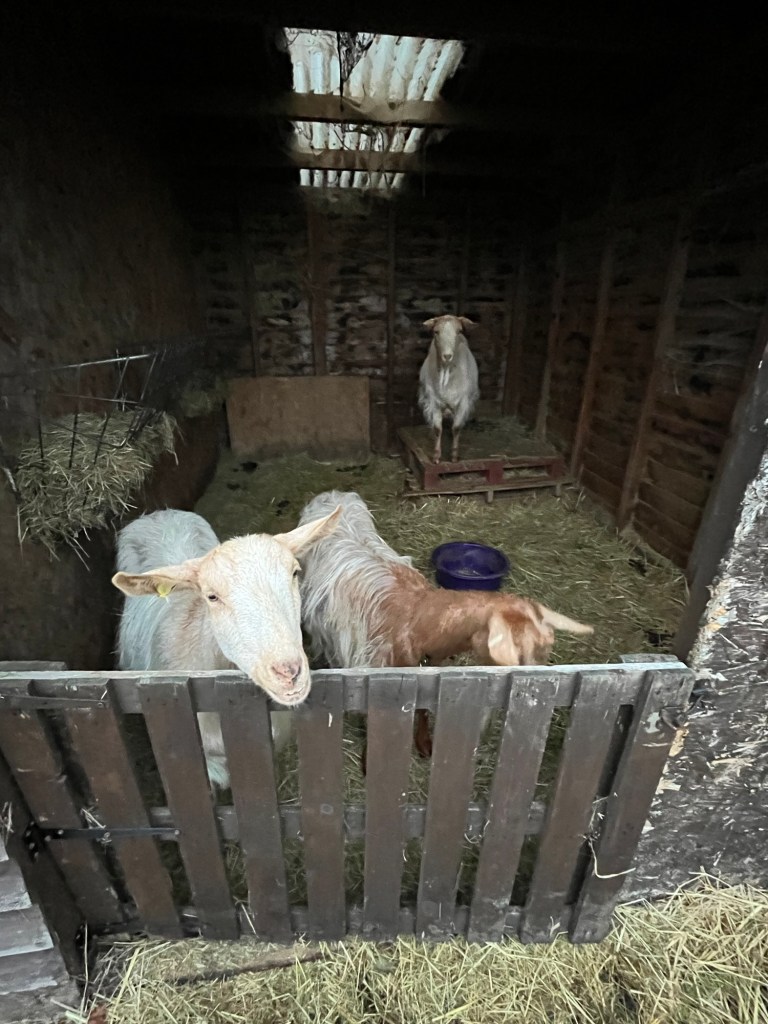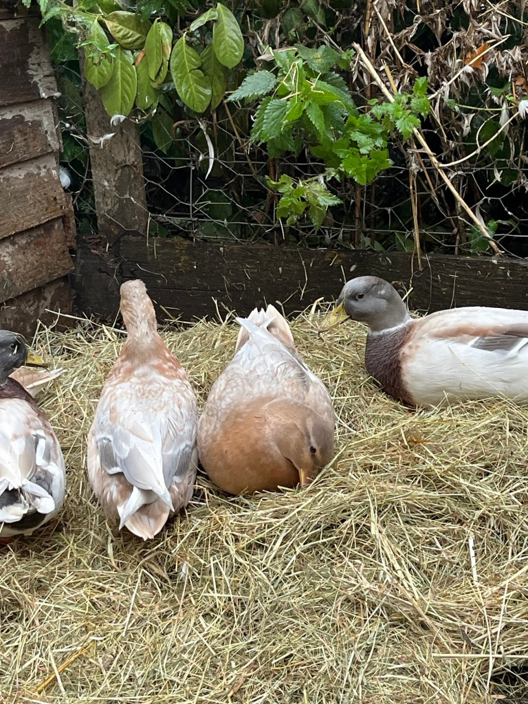 Fresh water in the duck bath and hay and straw around the pond (the hay is wasted hay that the goats pull out of their feeders and trample on). Goats (ours certainly) can be quite fussy eaters and ours are spoilt rotten.